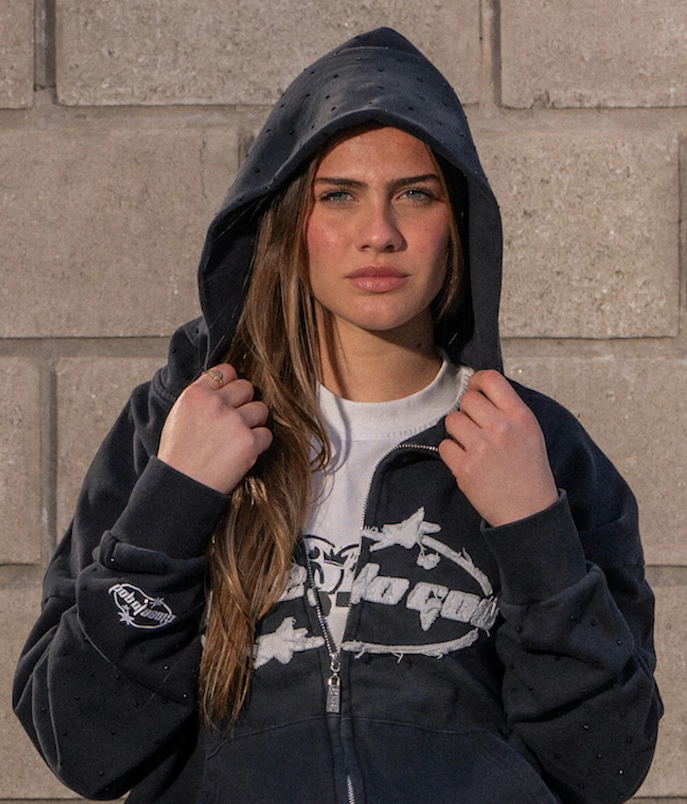 Presenta pedrería negra de alta fijación en la capucha y mangas, un aplique de tela con el logo de la marca y un bordado en la manga derecha.